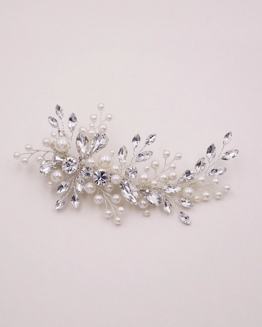 This brilliant crystal wedding hair clip is perfect to add to your hair on your most special day. Measuring 5" wide by 2" tall, this delicate rhinestone encrusted clip features clusters of round, pear and marquise crystals and glass pearls set in silver plating. This handmade comb has branches that can be moved to your liking.