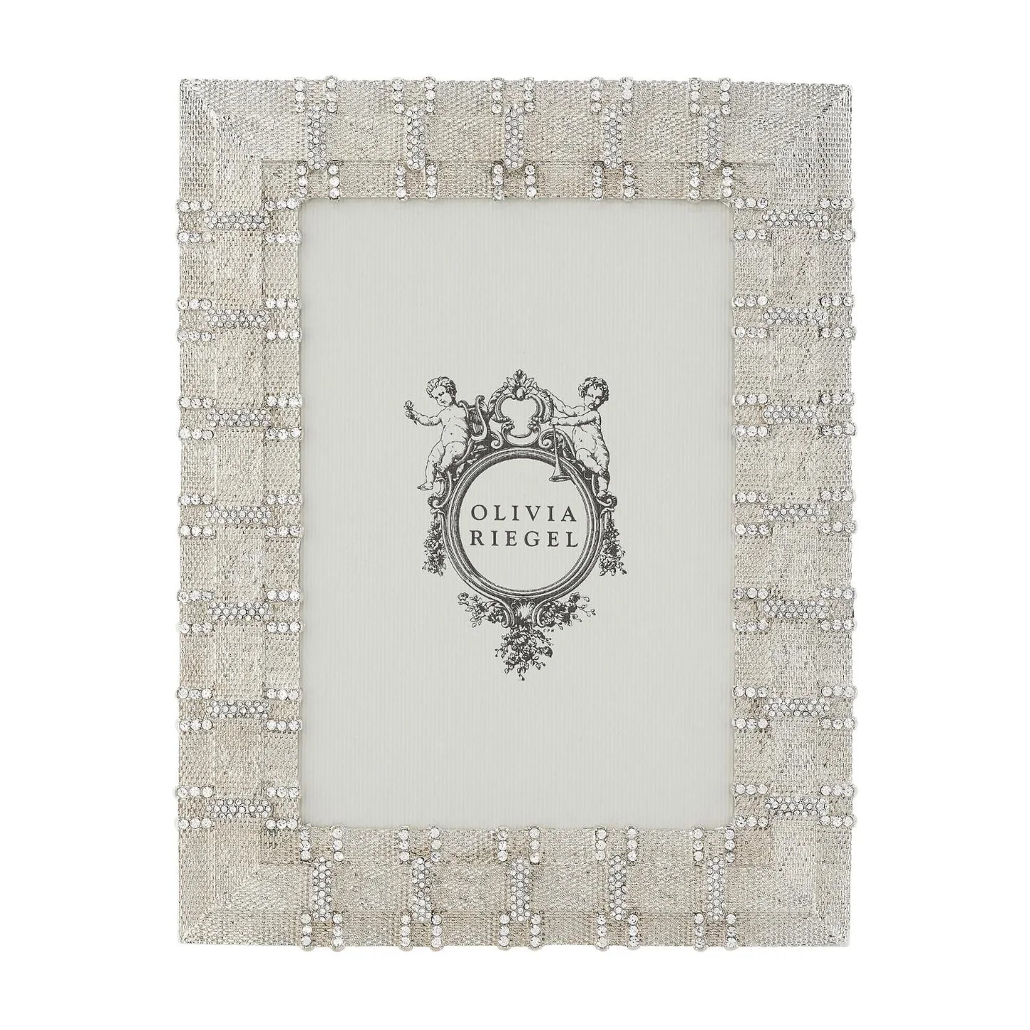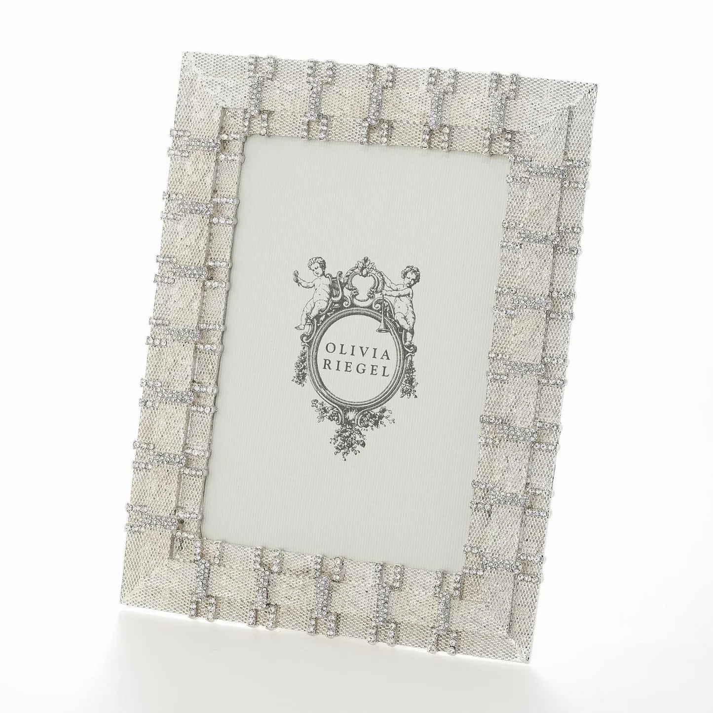 Texturized silver or gold finished pewter picture frame with banding, heavily encrusted with rows of hand-set clear pavé European crystals. Elegant moiré silk back, with easel designed for vertical or horizontal placement. Beveled glass. Tarnish resistant. Signature luxury gift box included.