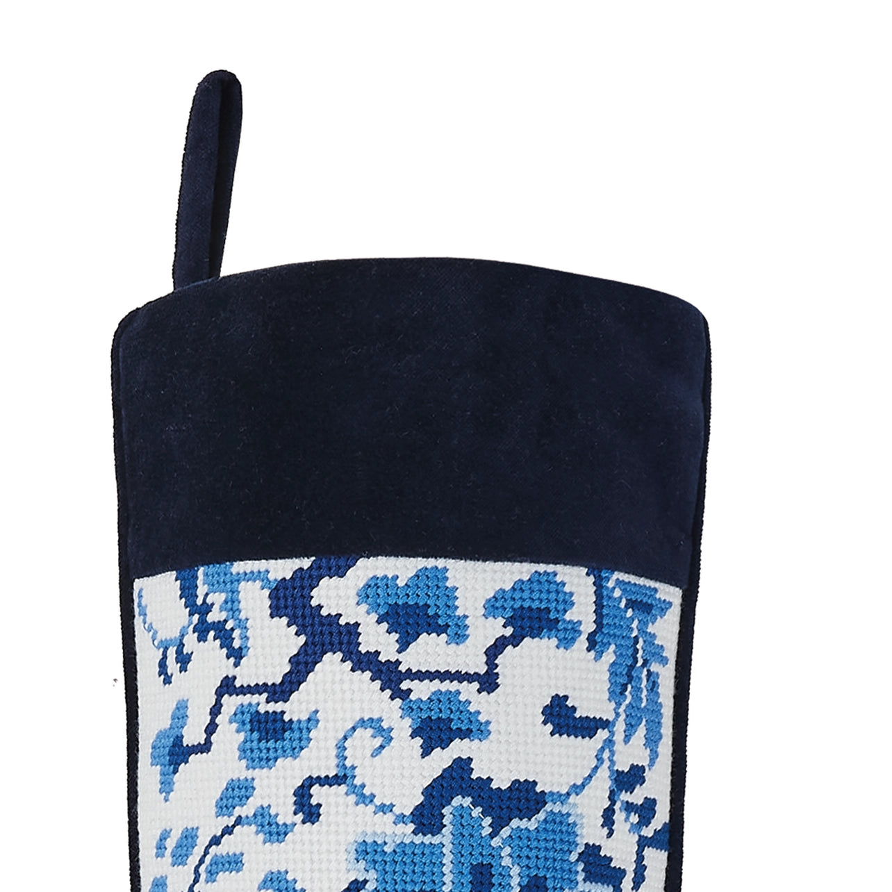 Elevate your holiday décor with the timeless elegance of this handcrafted needlepoint-style stocking. Meticulously made with 100% wool on the front and finished with a sumptuous cotton velvet back, it exudes warmth and sophistication.