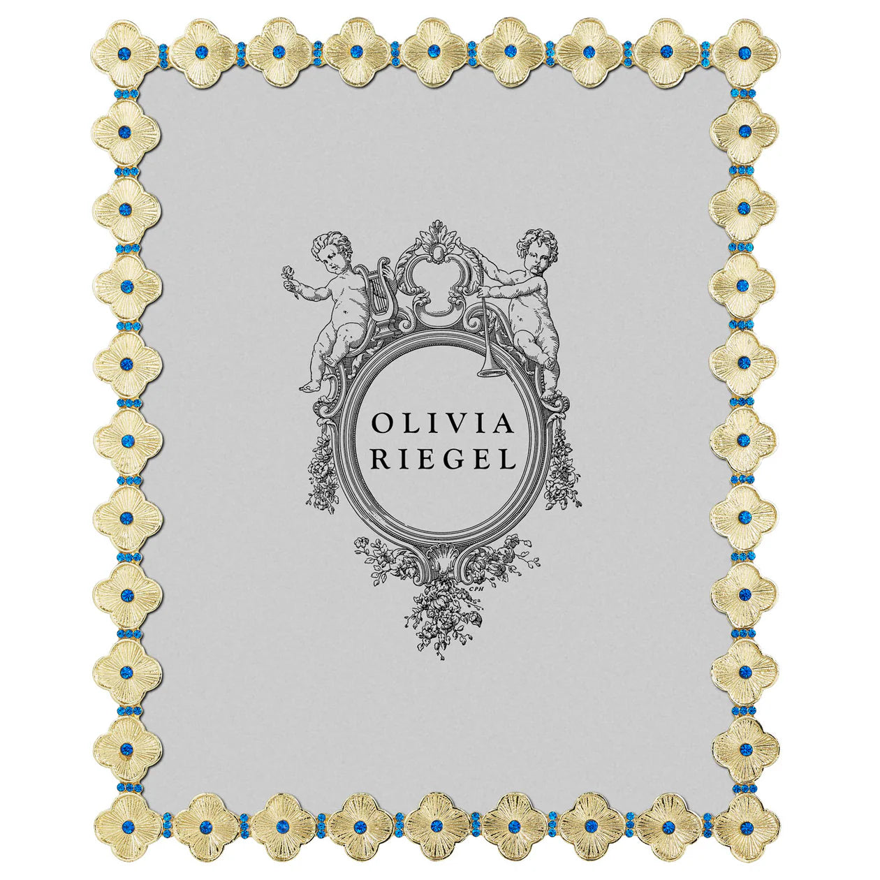 Inspired by the historic quatrefoil design - a decorative element utilized in architecture and the arts for millennia. Gold finished radial-textured pewter, adorned with hand-set blue European crystals. Elegant navy hued moiré silk back, with easel designed for vertical or horizontal placement. Tarnish resistant. Signature luxury gift box included.