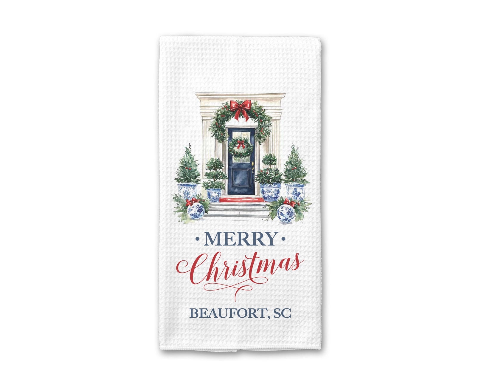 Customize this towel for your town! This holiday towel is the perfect addition to your Christmas kitchen decor, and also makes a great housewarming gift.