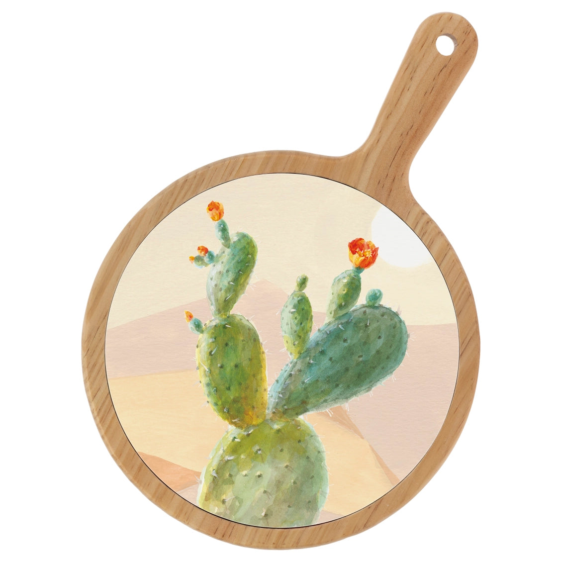 Bring sun-washed desert charm to your spread with the Desert Greenhouse Cheeseboard, featuring a smooth ceramic serving surface framed by warm bamboo and adorned with watercolor cacti.