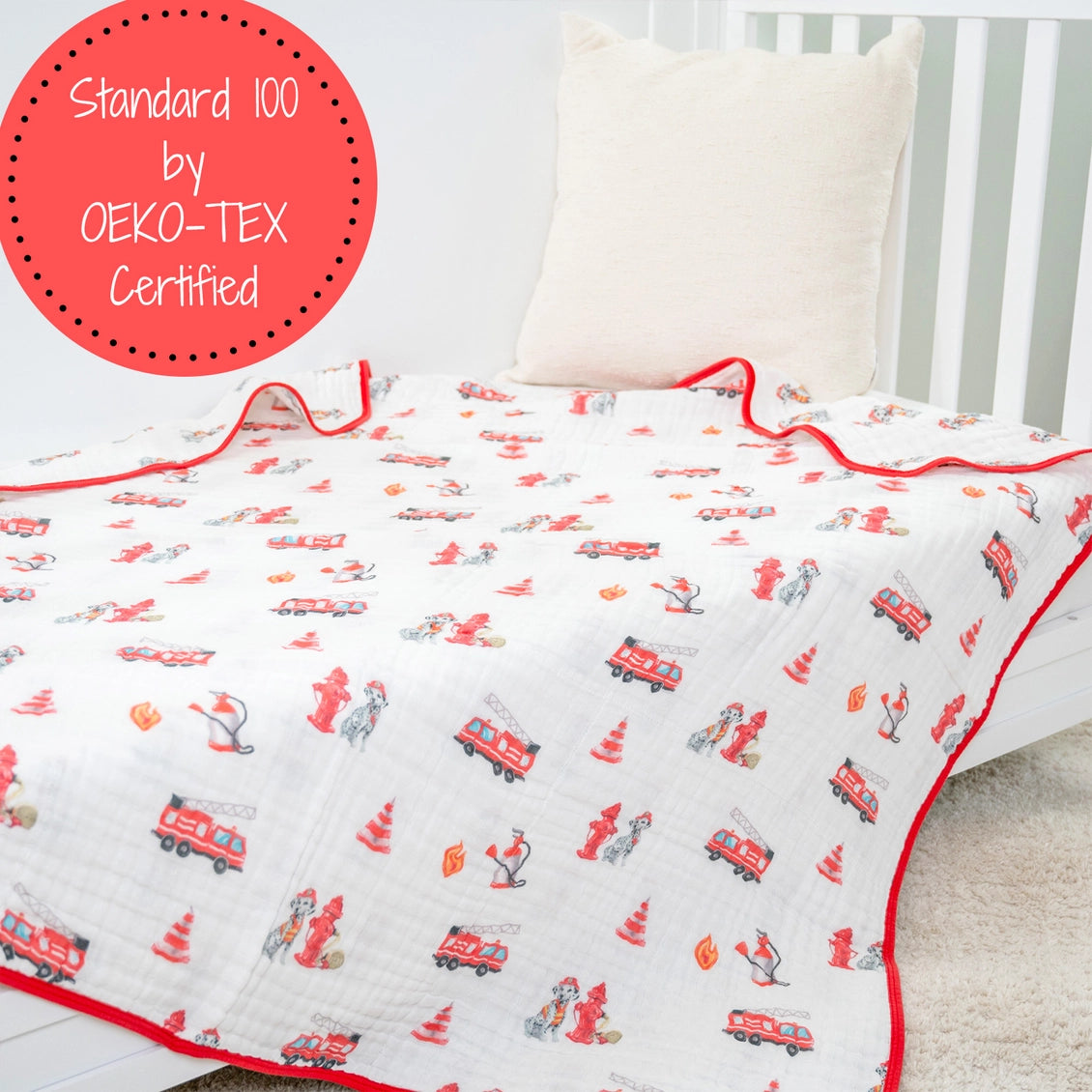FIREMAN-THEMED BABY BLANKET - This fireman dog print is perfect for keeping in the nursery or using as a stroller cover for your baby.