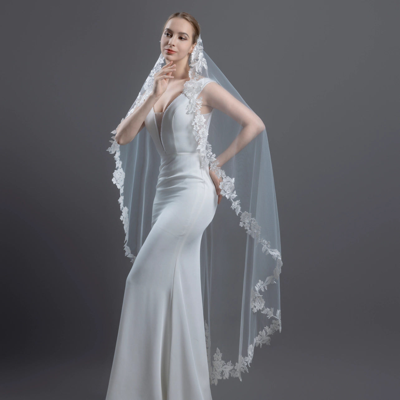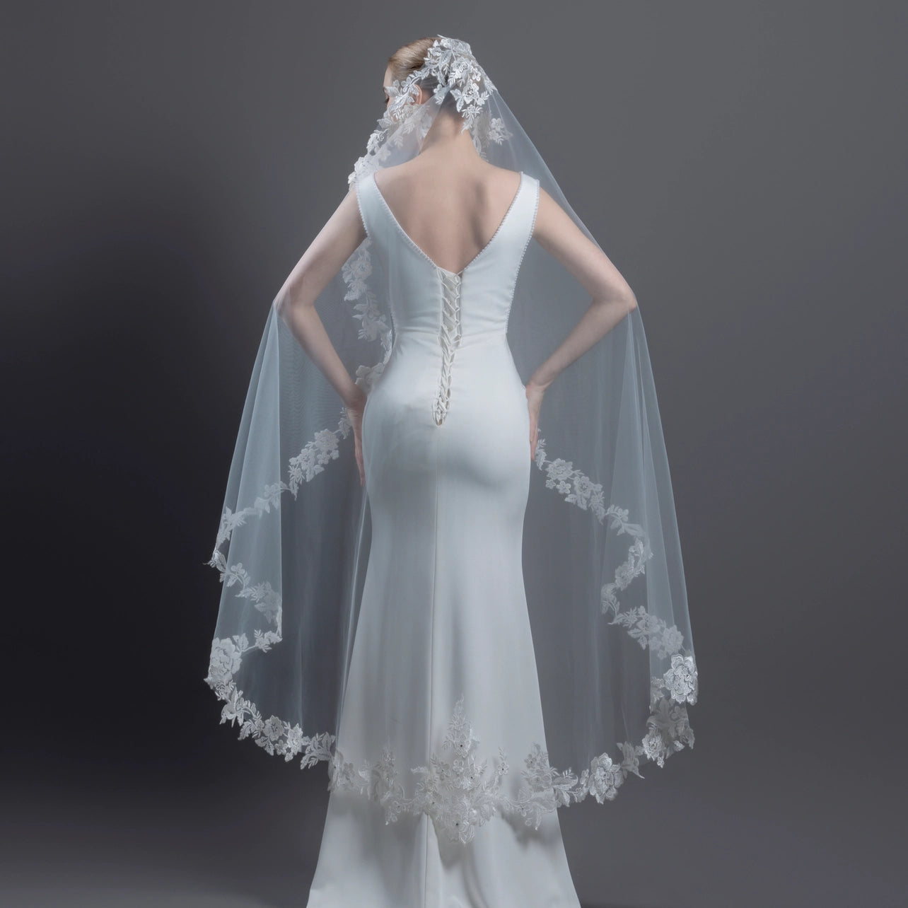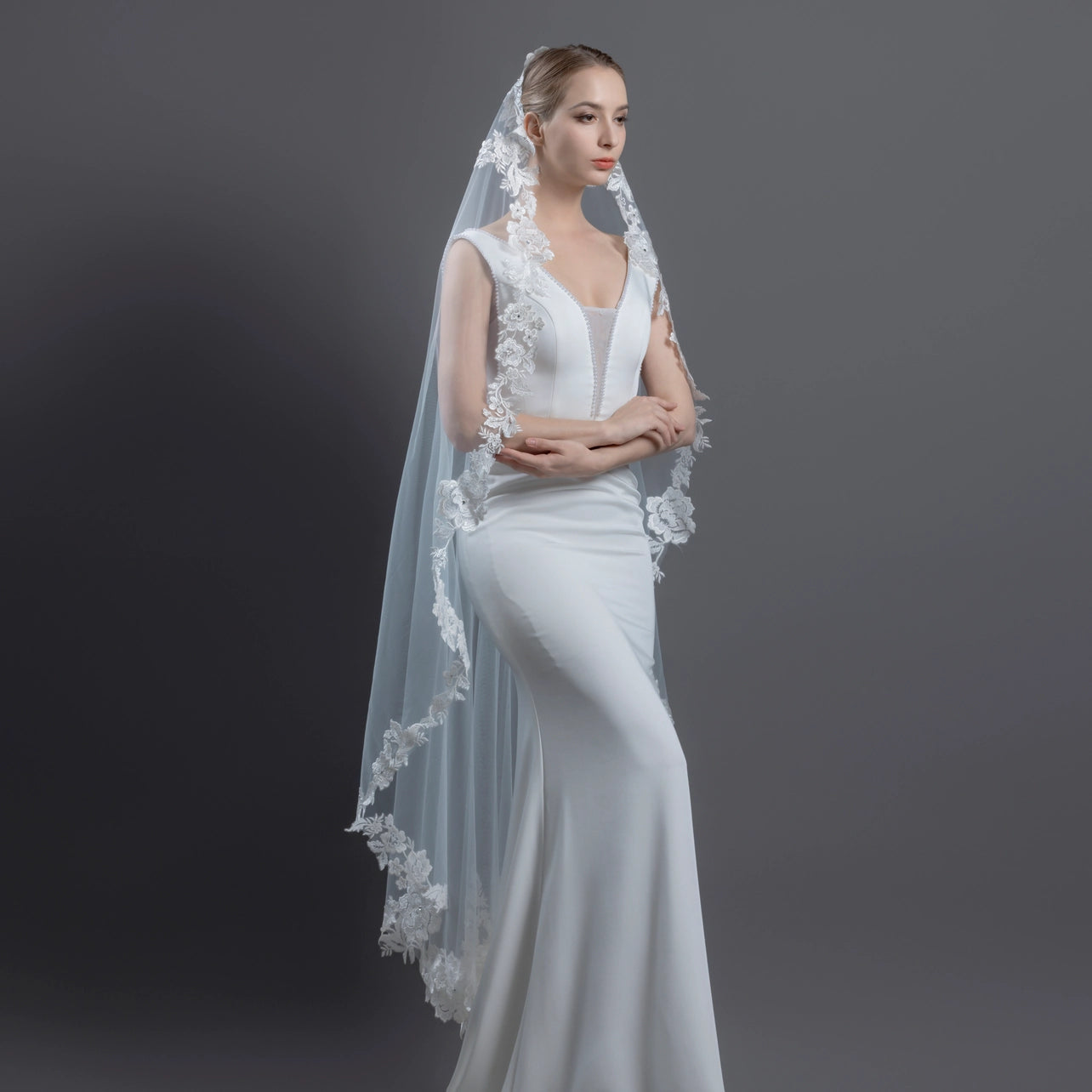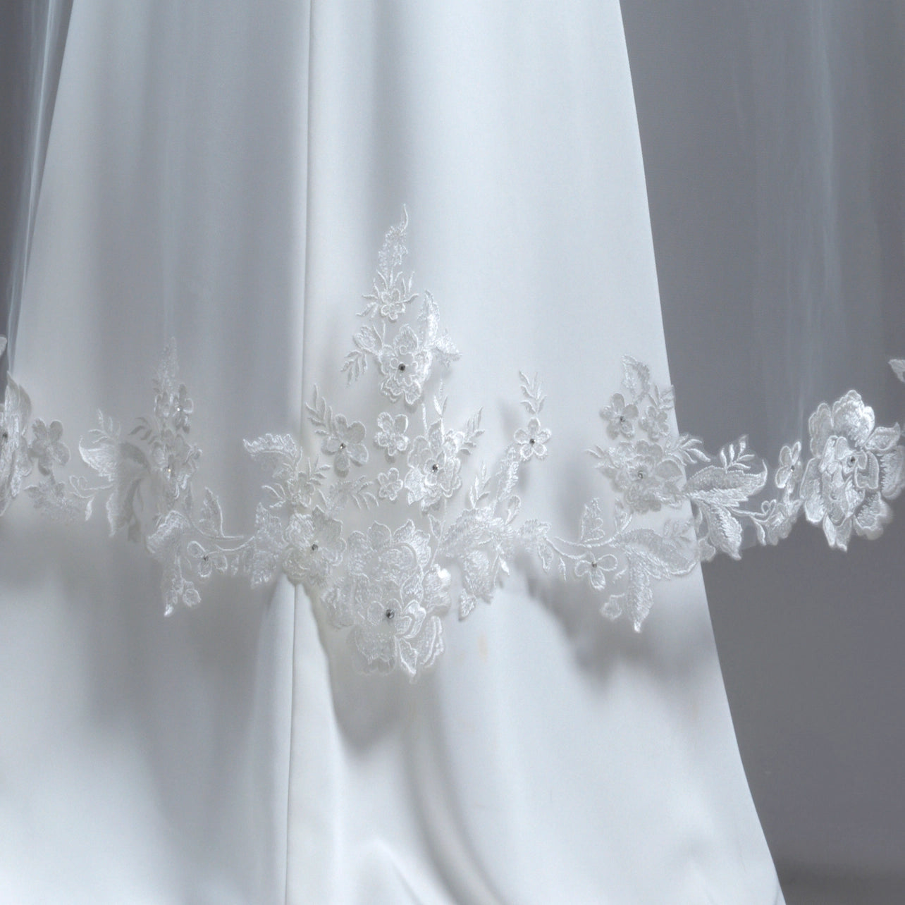 This ivory bridal Mantilla veil, measuring 60" X 72" features then floral vine embroidered lace with rhinestone crystals and sequins on the bottom edge. Premium flexible tulle wrapped metal wire comb. Soft tulle.