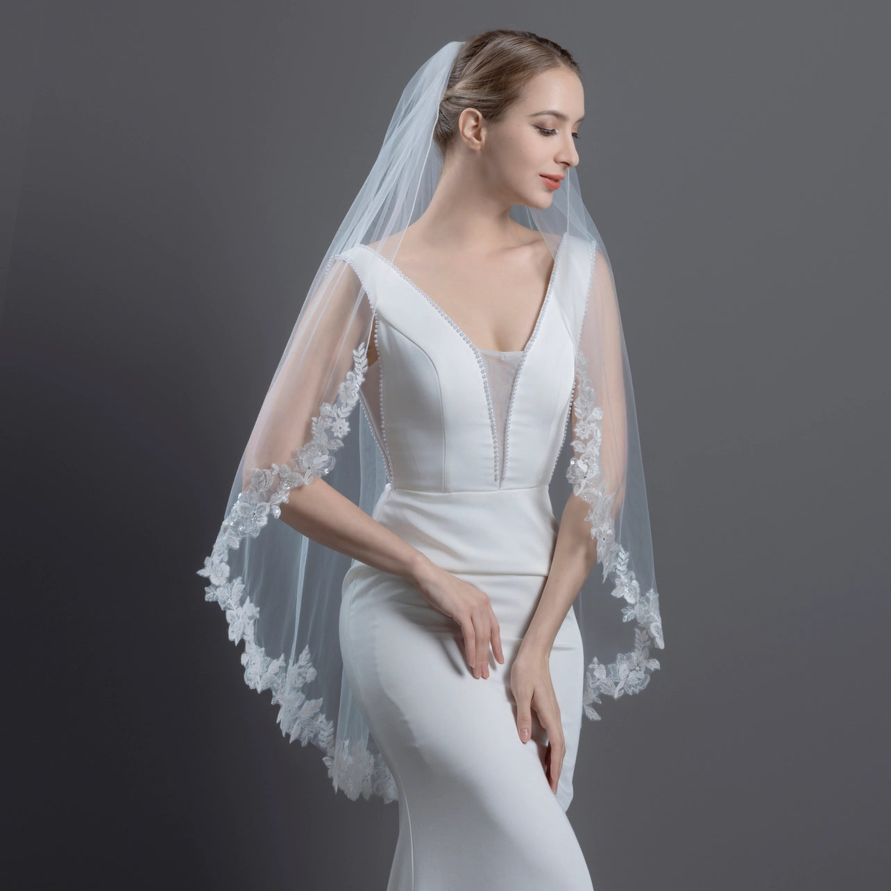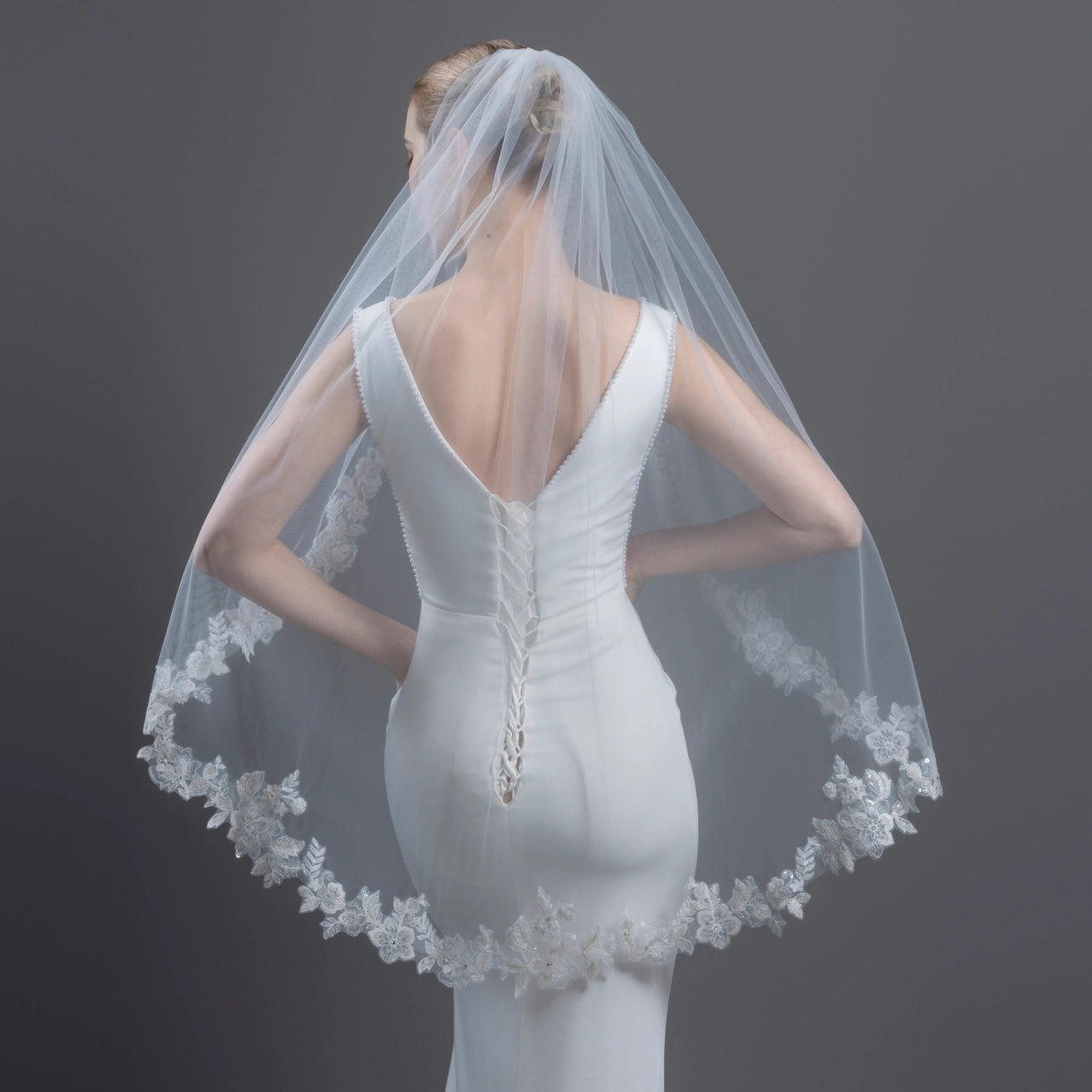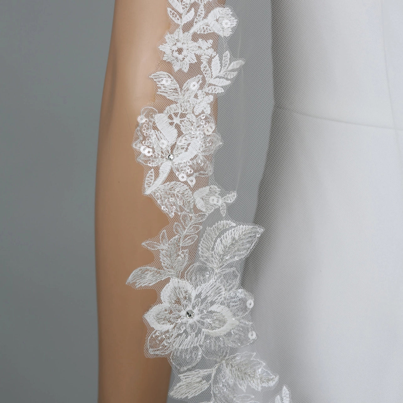 This ivory bridal veil, measuring 42" X 60" features a hemmed pencil edge to about chest level, then floral vine embroidered lace with rhinestone crystals and sequins on the bottom edge. Premium flexible tulle wrapped metal wire comb. Soft tulle.