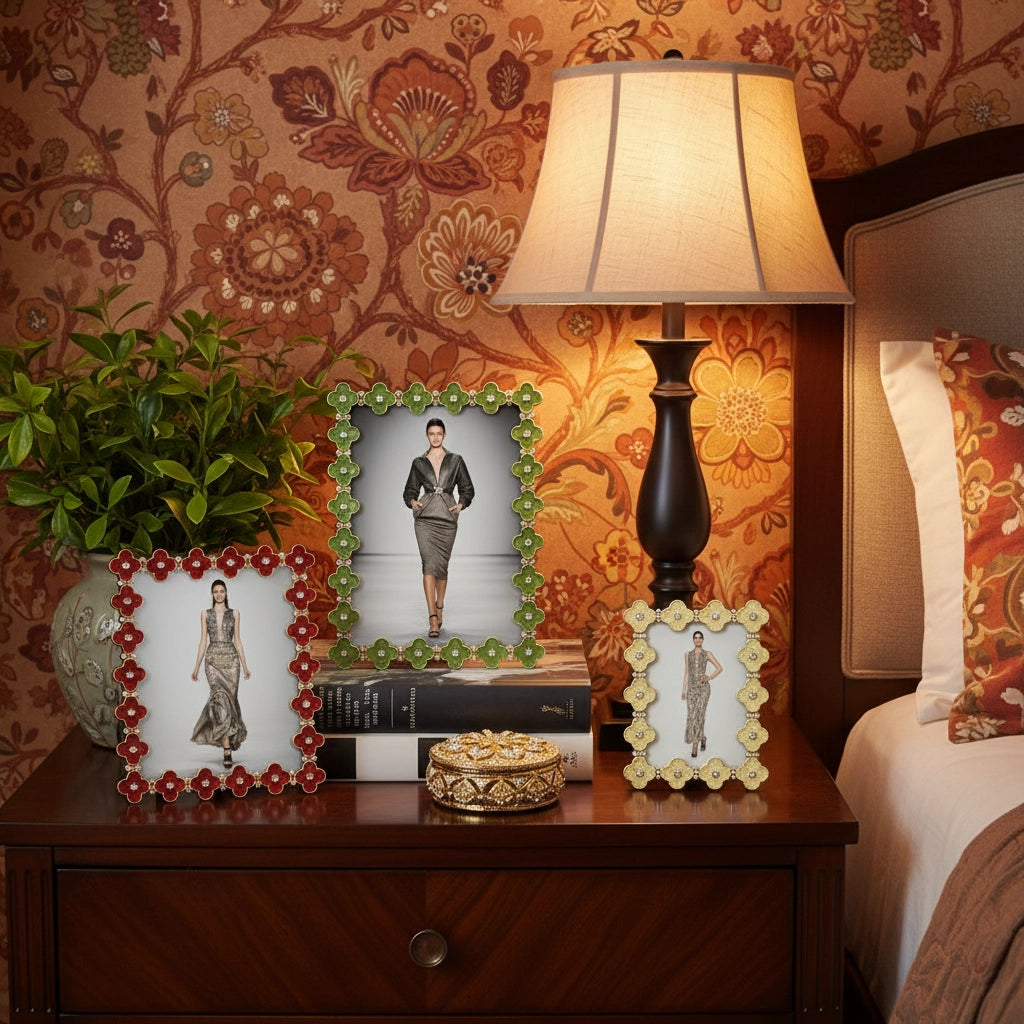 Inspired by the historic quatrefoil design—a decorative element utilized in architecture and the arts for millennia. Gold finished pewter picture frame, adorned with celadon green hued hand-enameling and hand-set clear European crystals. Elegant moiré silk back, with easel designed for vertical or horizontal placement. Tarnish resistant. Signature luxury gift box included.