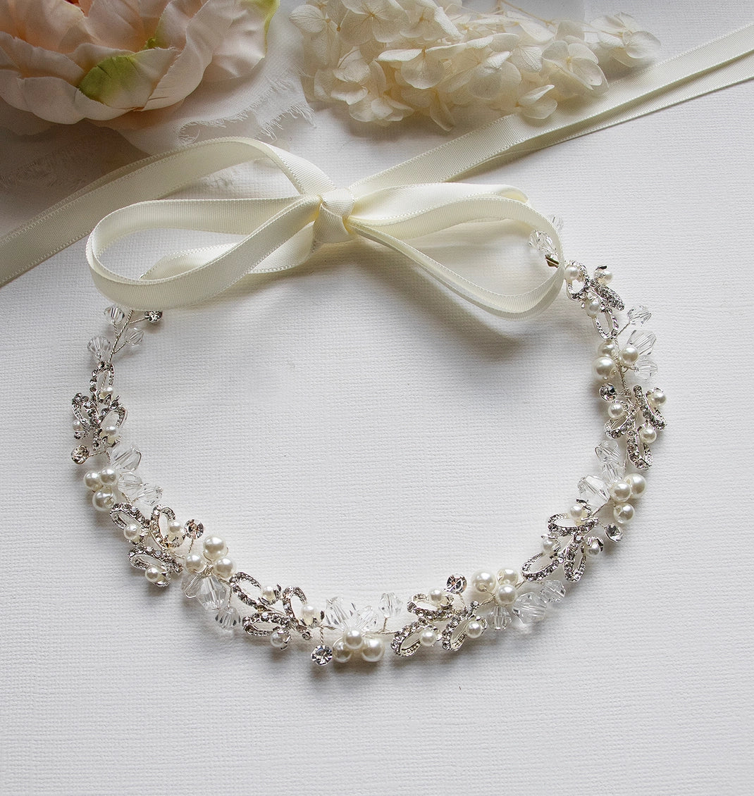 This brilliant, versatile silver hair vine headpiece boasts shining rhinestones and Swarovski bicone crystals in a cluster pattern with accents of ivory glass pearls. Measuring 3/4" wide, this sparkling headpiece is sure to add beauty to your special day! This gorgeous hair vine can be worn as a vine or with attached ivory ribbon. This headband is perfect for weddings, bridesmaids, prom, and parties!