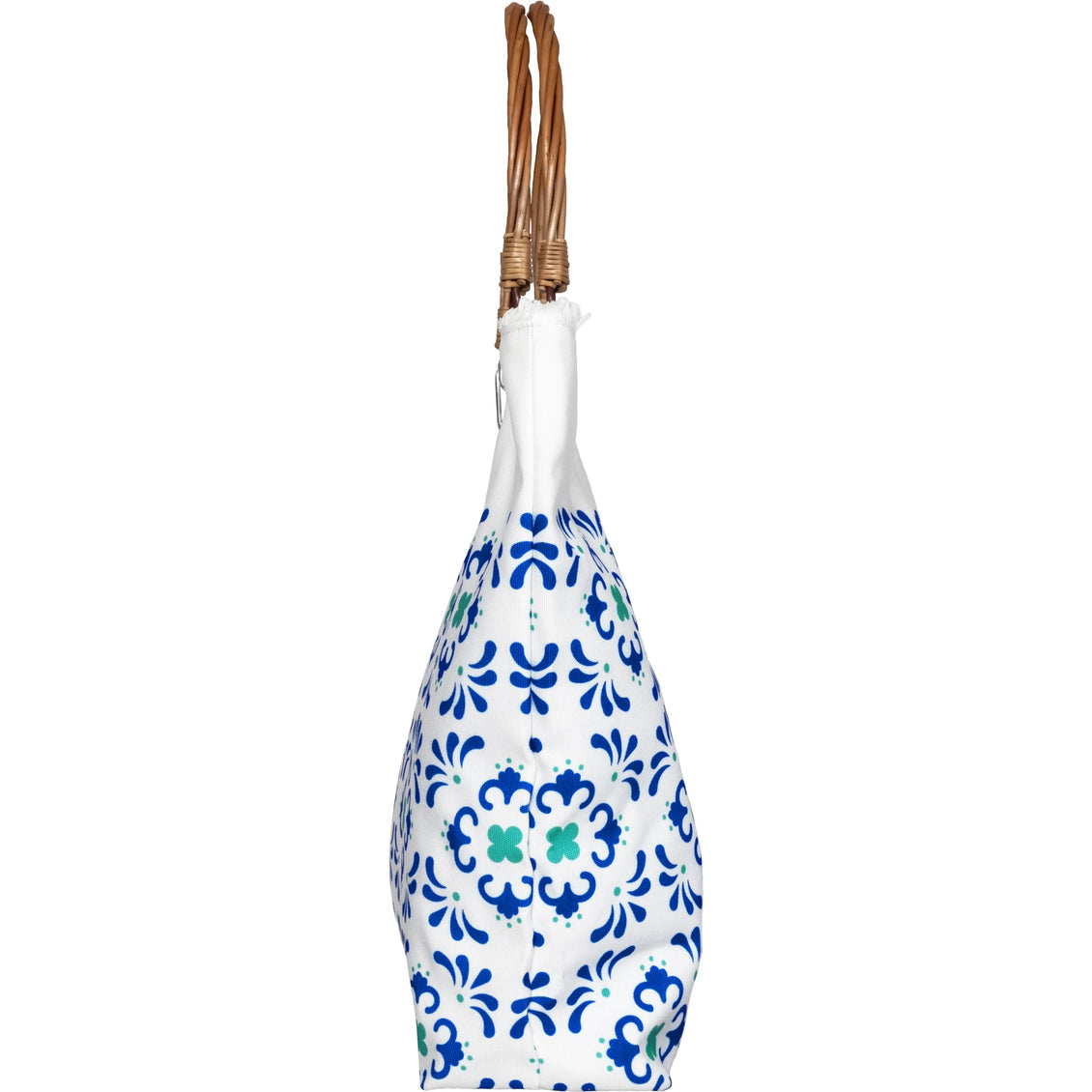 Featuring a stunning Mediterranean-inspired blue and white floral pattern, this tote captures the serene beauty of coastal life. The interior showcases a custom "dreaming" script pattern in a deep blue, adding an artistic flair and reinforcing the theme of relaxation and escape.