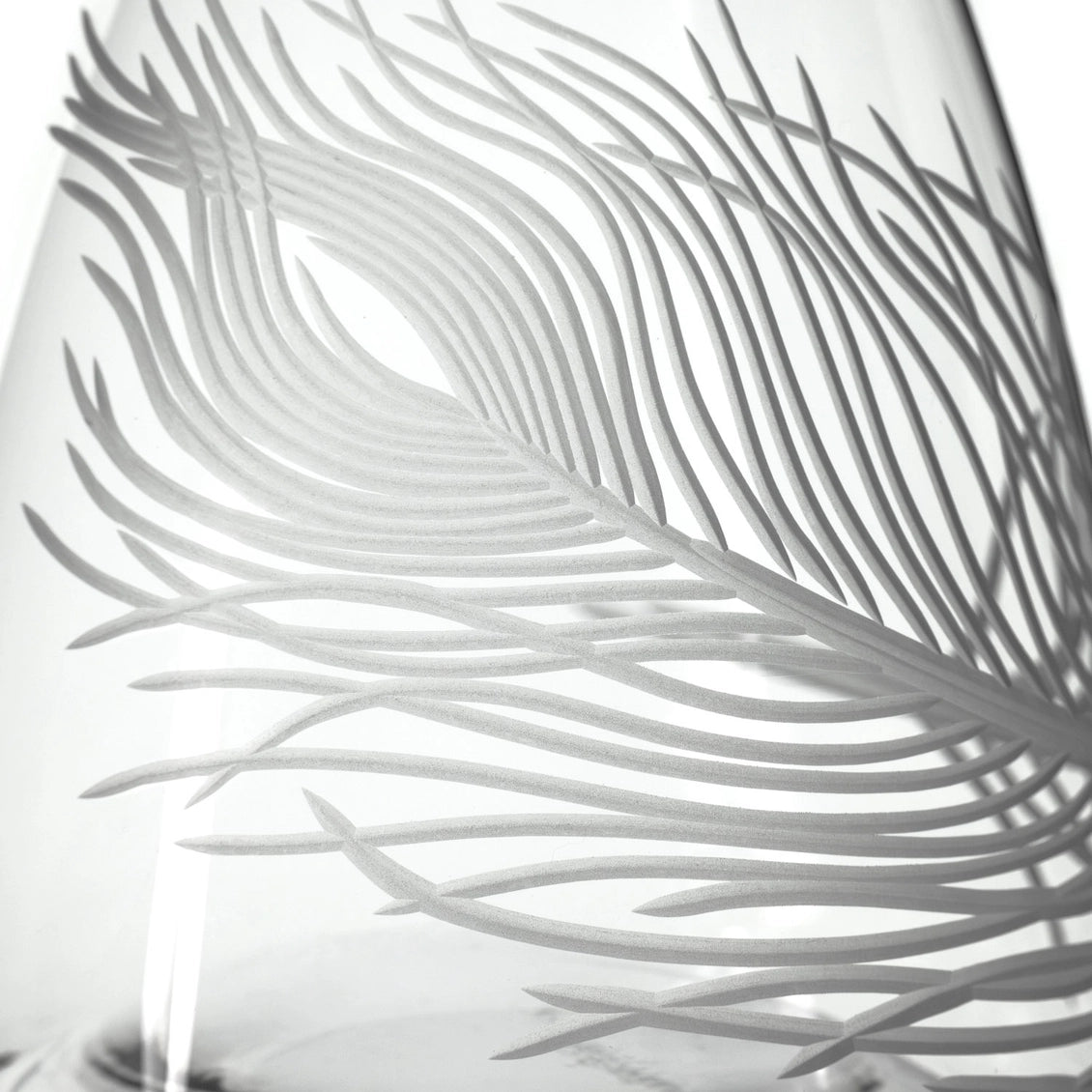 Crafted from high-quality glass from Slovakia and engraved in Pennsylvania, this carafe adds a refined touch to any barware collection. • 37.25oz capacity wine carafe; hand wash only • Etched peacock feather design, diamond-wheel engraved • Height: 11" | Diameter: 5 1/8"