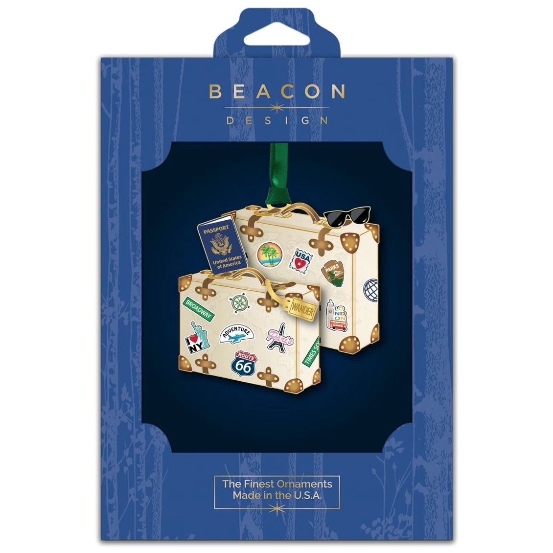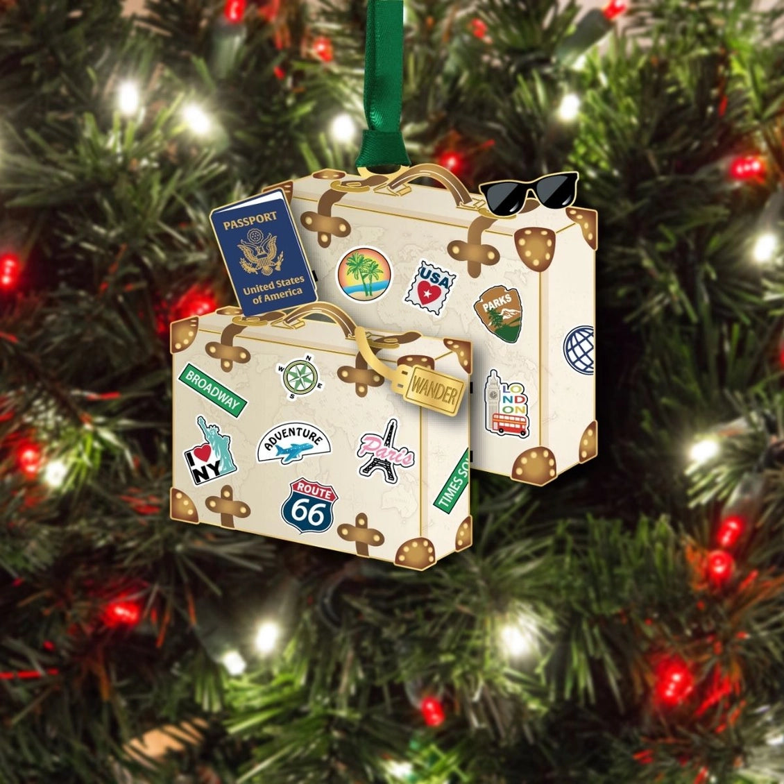 The ‘Wanderlust’ ornament captures the spirit of adventure with vintage-style suitcases decorated with travel stickers from around the world. This charming piece is perfect for those who love to explore.